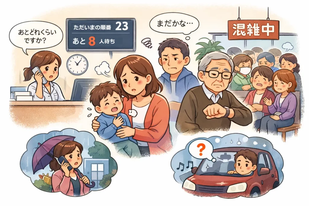 クリニックにおける最大の課題の一つが、待ち時間に対する患者様のストレスです。診療の特性上、急患対応や処置内容によって診察時間は前後しやすく、どうしても待ち時間が発生します。問題は「待つこと」そのものよりも、あとどれくらい待つのか分からない状態にあります。実際、多くの医療機関では「今何人待っていますか?」「あとどれくらいですか?」といった問い合わせが電話や受付に集中し、スタッフ様の業務負担を増やしています。特に午前診療のピーク時には、対応だけで時間が取られ、本来集中すべき診療補助業務に支障が出るケースも少なくありません。