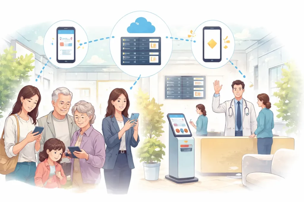そして多くの医療機関で現実的に採用されているのが、待ち時間の見える化や呼出通知といった仕組みです。これらは特定の患者様だけを優遇するものではなく、すべての患者様の待ち時間体験を改善する方法です。