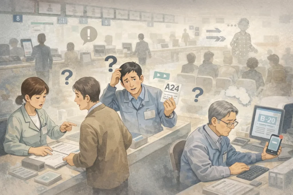 窓口の負担を見えにくくしている要因として、最初に選ばれた用件と実際に必要な手続きが一致しないケースも挙げられます。来庁者は自分に必要な手続きを正確に判断できないこともあり、受付後に別窓口への案内が必要になる場面があります。このとき、単に「別の窓口へ行ってください」と伝えるだけでは、来庁者の不安が増え、現場でも説明や再受付の手間が発生しやすくなります。
